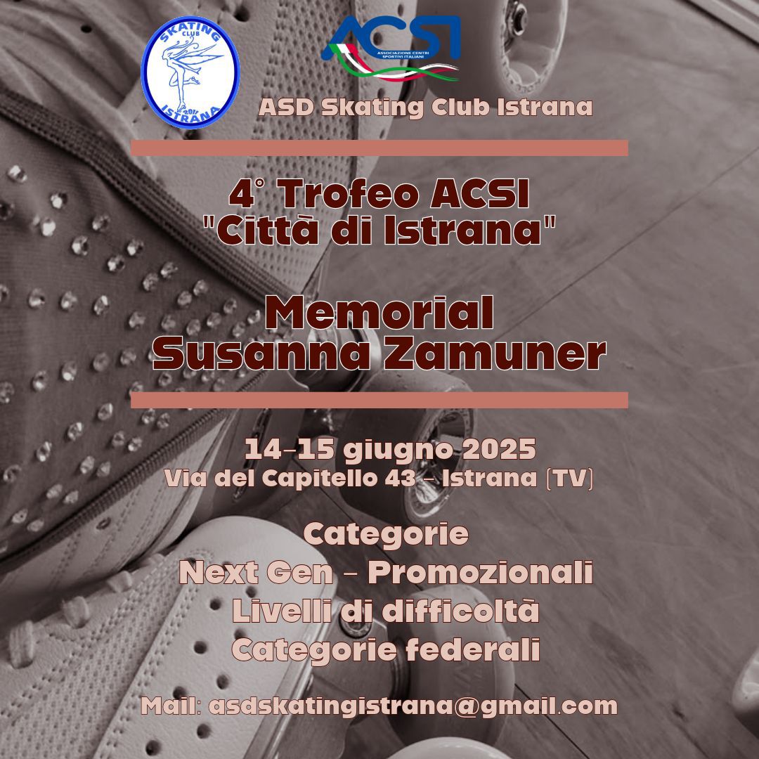 La Direzione Nazionale ACSI Settore Sport, Commissione Pattinaggio Artistico, in collaborazione con ASD Skating Club Istrana, organizza il 4° Trofeo ACSI SKATING CLUB ISTRANA 2025 (Memorial Susanna Zamuner), che si svolgerà nei giorni 14 e 15 Giugno 2025.