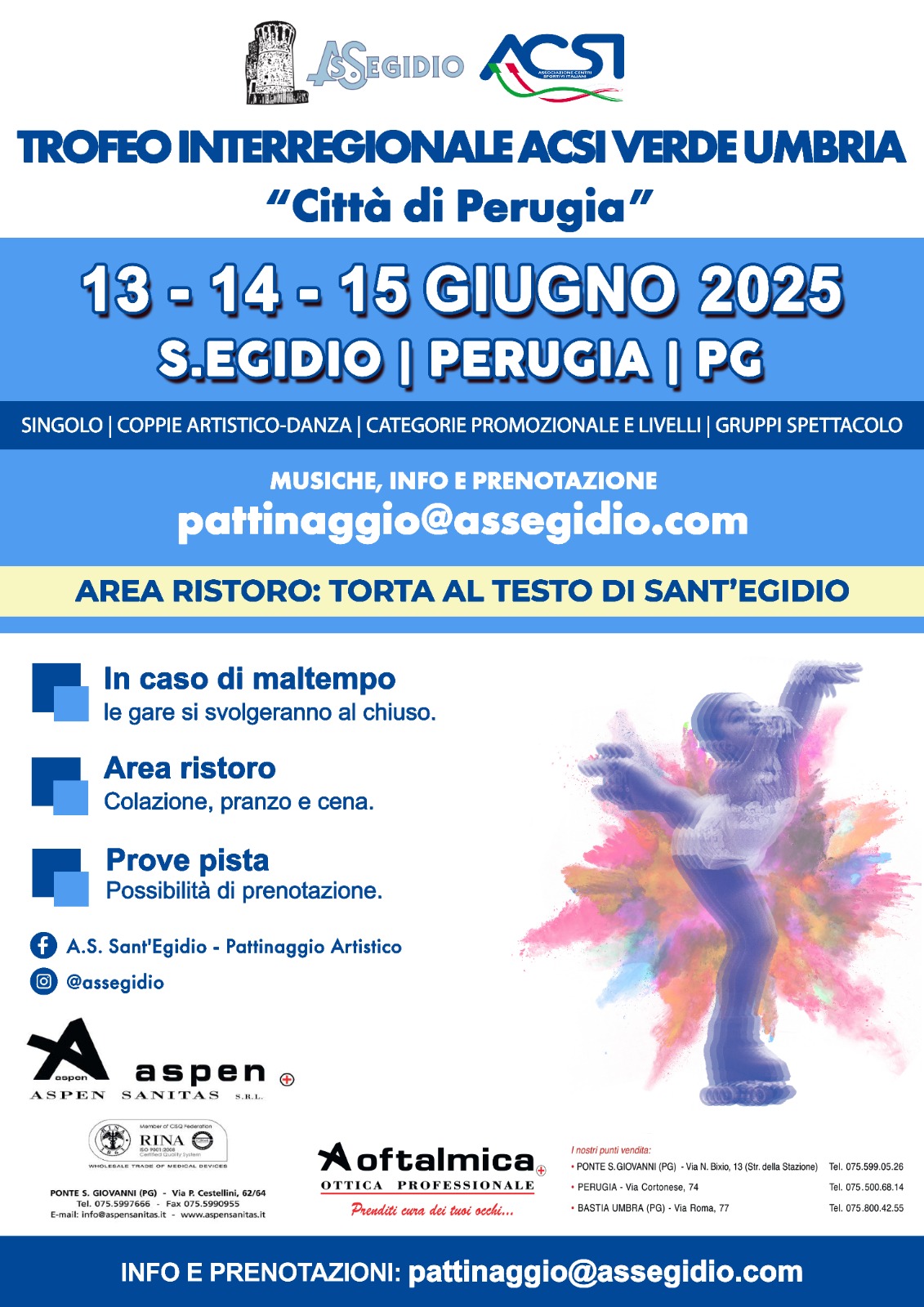 La Direzione Nazionale ACSI Settore Sport, Commissione Pattinaggio, con il Patrocinio del Comune di Perugia e CONI Regionale, con la collaborazione della Società S.EGIDIO A.P.S. -A.S.D. organizza a S. Egidio (PG), dal 13 al 15 Giugno 2025 il 4° TROFEO INTERREGIONALE ACSI VERDE UMBRIA “Città di Perugia”, gara di Pattinaggio artistico .