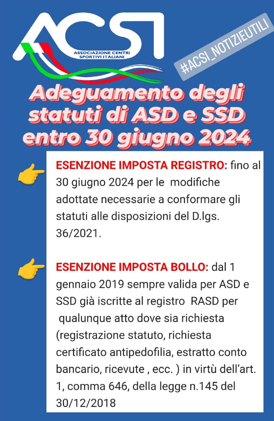 L’Acsi nazionale rende noto che entro il 30 giugno 2024 gli statuti di ASD e SSD vanno adeguati secondo le seguenti direttive: