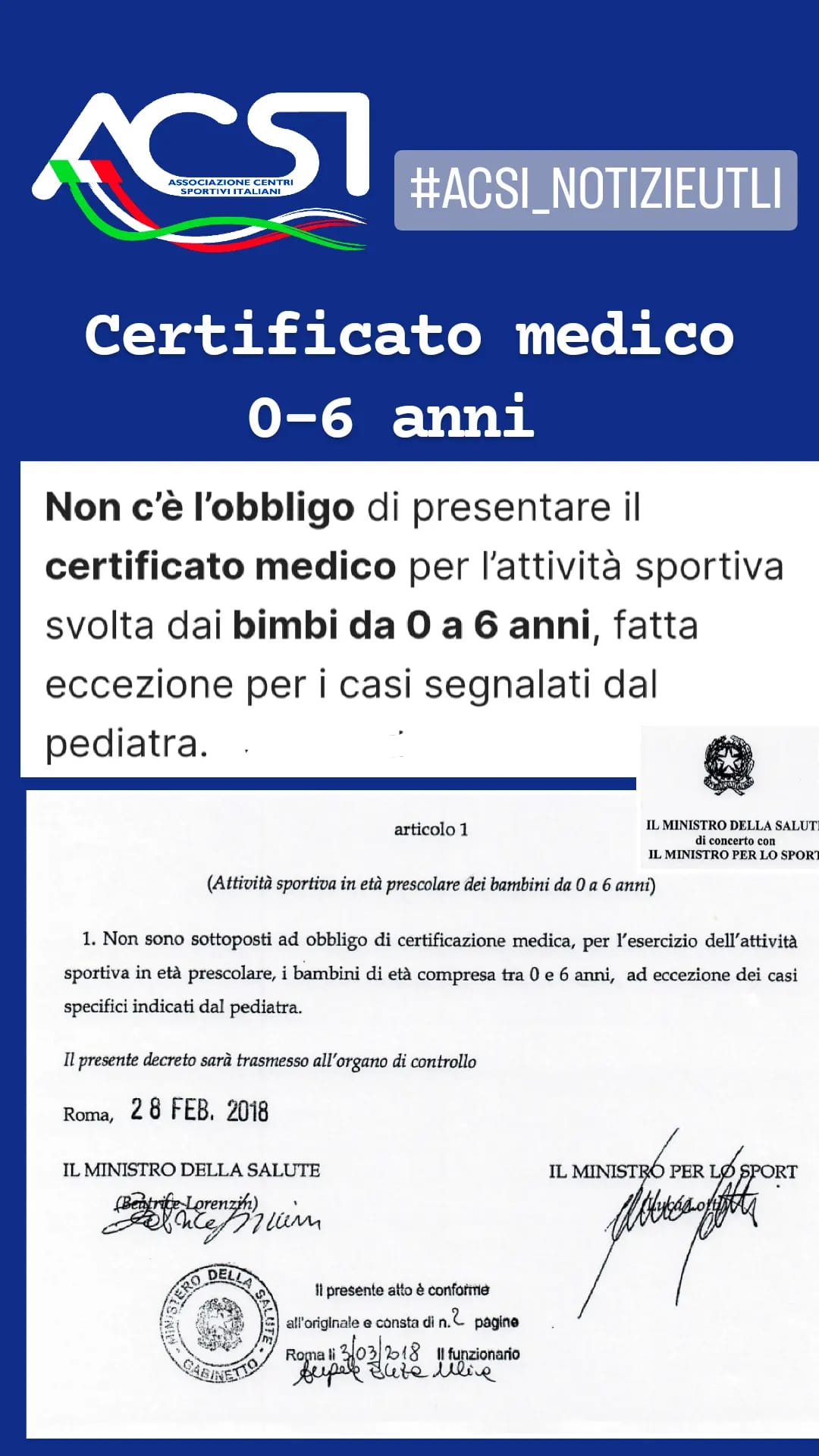 Acsi ribadisce in una sua nota che non c’e’ obbligo di presentazione del certificato medico per l’attività sportiva svolta dai bambini da 0 a 6 anni. Unica eccezione si ha per i casi segnalati dal pediatra.